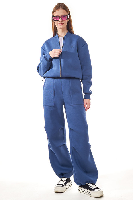 Современный комфортный костюм, состоит из брюк карго и укороченного бомбера. Отлично подойдёт для дома, прогулок, путешествий и отдыха. Пошит из теплой, комфортной ткани. Бомбер прямого силуэта, с застежкой молнией из металла. Горловина, манжеты рукавов выполнены из ткани-компаньона кошкорсе. На левом переде вышивка-логотип в цвет ткани. Бомбер с кулисой по низу с резинкой внутри и фиксаторами на боковых швах. Брюки расширенные к низу, с возможностью заузить и зафиксировать ширину внизу (низ имеет кулиску с резинкой и фиксатором). На передних половинках брюк удобные накладные карманы, складки в районе линии колен. Пояс из ткани компаньена кошкорсе со шнуром и резинкой внутри.