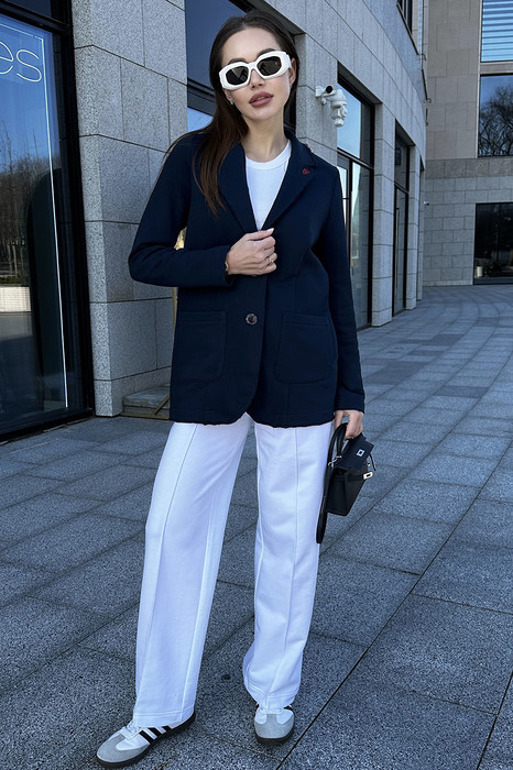 Костюм Gowear из футера в стиле smart casual поможет создать в меру строгий и одновременно расслабленный образ. Костюм состоит из жакета и прямых брюк. Жакет прямого силуэта с воротником и лацканами, имеет удобные карманы и застежку на 2 пуговицы. На левом лацкане вышивка-логотип в контрастном цвете. Низ и борта имеют открытые края (эффект необработанного шва), укреплены дополнительной строчкой. Жакет без подкладки. Брюки прямые. На передних половинках - отделочная строчка по стрелкам и удобные боковые карманы. Пояс из ткани кошкорсе, с резинкой и контрастным шнурком.