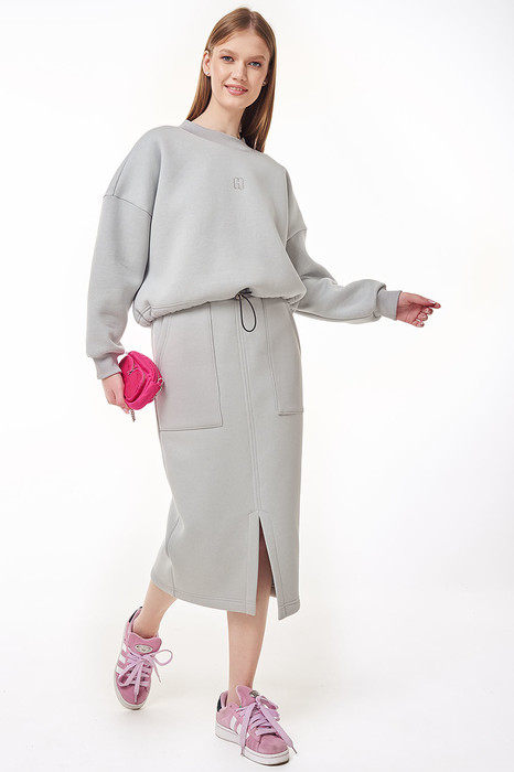 Современный комфортный костюм, состоит из зауженной юбки и укороченного свитшота. Отлично подойдёт для офиса, прогулок и путешествий. Пошит из теплой, комфортной ткани. Свитшот покроя оверсайз со спущенной линией плеча. Горловина, манжеты рукавов выполнены из ткани-компаньона кошкорсе. По центру переда вышивка-логотип в цвет ткани. Свитшот с кулисой по низу с резинкой внутри и фиксатором по центру переда. Юбка зауженная к низу, облегающая фигуру, длиной миди. Перед с удобными боковыми карманами, по центру переда разрез с отделочной строчкой. Пояс из ткани кошкорсе с резинкой внутри.