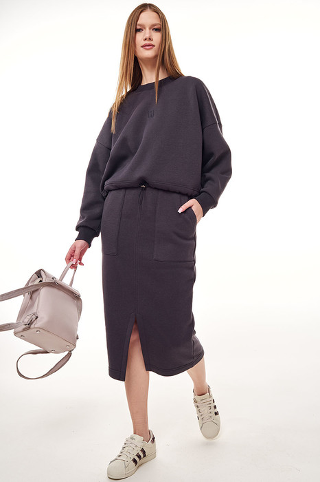 Современный комфортный костюм, состоит из зауженной юбки и укороченного свитшота. Отлично подойдёт для офиса, прогулок и путешествий. Пошит из теплой, комфортной ткани. Свитшот покроя оверсайз со спущенной линией плеча. Горловина, манжеты рукавов выполнены из ткани-компаньона кошкорсе. По центру переда вышивка-логотип в цвет ткани. Свитшот с кулисой по низу с резинкой внутри и фиксатором по центру переда. Юбка зауженная к низу, облегающая фигуру, длиной миди. Перед с удобными боковыми карманами, по центру переда разрез с отделочной строчкой. Пояс из ткани кошкорсе с резинкой внутри.