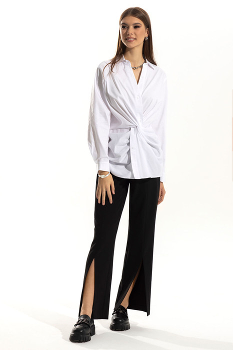Блузка с отложным воротником с отрезной стойкой, центральной фигурной застежкой на петли и пуговицы. Полочки блузки с декоративным элементом в форме перекрученного узла. По боковым швам полочки с односторонними складками. Спинка с талиевыми вытачками. Брюки с отрезным поясом, на поясе расположены шлевки. В боковых швах расположены карманы. Вход в карман наклонный к боковому шву. Застежка гульфик.