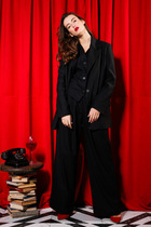 Блузка, без воротника, с круглым вырезом горловины, застежкой на навесную петлю и пуговицу в среднем шве спинки. По переду со средним швом и декоративным узлом. По спинке со средним швом и резинкой по низу. Рукав втачной, короткий. Юбка прямая, без пояса, верх обработан обтачками. Застежка на потайную молнию в среднем шве спинки. Переднее полотнище со средним швом, заканчивающимся разрезом.
