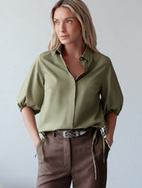 Блузка с центральной застежкой на навесные петли и пуговицы по вставке переда. Воротник отрезной- стойка. По вставке переда- четыре складки- защипа. Спинка со средним швом. Рукав короткий, цельнокроенный, с отложной манжетой. Брюки- с отрезным поясом. Пояс присборен на резинку. По боковым швам расположены карманы. Вход в карман наклонный к боковому шву.