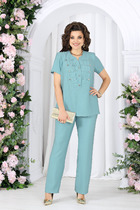 Блузка с втачным воротником с отрезной стойкой, центральной застежкой петли и пуговицы. По левой полочке на уровне груди расположен накладной карман. Спинка с отрезной кокеткой. Рукав втачной, длинный, с отрезной манжетой. Шорты прямые, с отрезным поясом, пояс присборен на резинку. В боковых швах расположены карманы. Вход в карман наклонный к боковому шву.