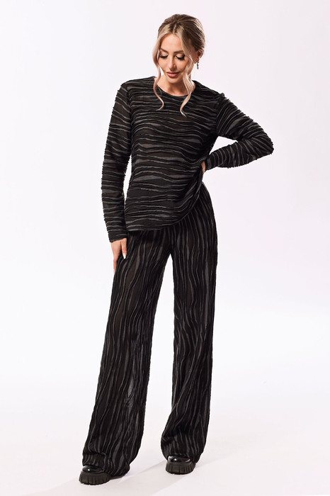 Блузон с застежкой на навесную петлю и пуговицу по горловине спинки, без воротника, с круглым вырезом горловины. По переду- кулиса со шнуром- завязкой. Спинка со средним швом. Рукав втачной, длинный. Брюки прямые, с отрезным поясом. Пояс присборен на резинку.