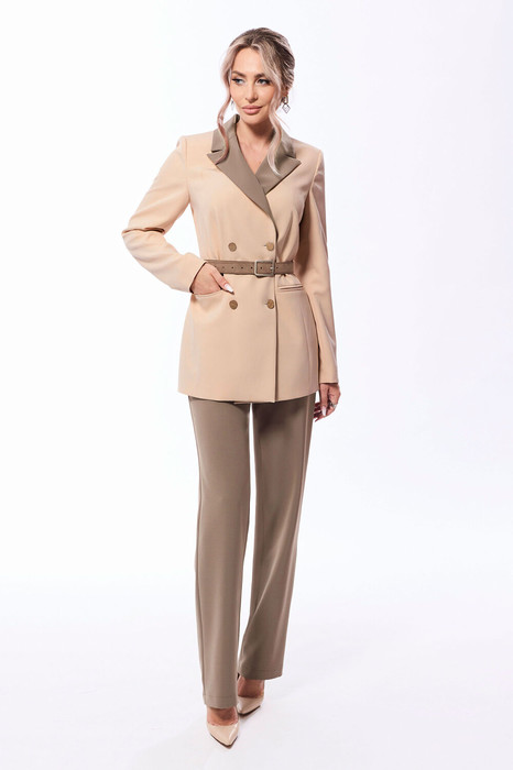 Жакет полуприлегающего силуэта с центральной двубортной застежкой на петли и пуговицы, с втачным воротником и отложными лацканами пиджачного типа. По переду с рельефами, выходящими из проймы, талиевыми вытачками. На уровне линии талии расположены прорезные карманы в рамку . Спинка со средним швом, рельефами, выходящими из проймы. Рукав втачной, длинный. Брюки прямые, с отрезным поясом, на поясе расположены шлевки. Пояс в области спинки присборен на резинку. На передних половинках расположены карманы, вход в карман наклонный к боковому шву. Застежка гульфик.