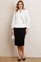 Жакет с центральной двубортной застежкой на петли и пуговицы, без воротника, с отложными лацканами. По переду с рельефами, выходящими из проймы до низа. По спинке со средним швом и рельефами, выходящими из проймы до низа. Жакет со сьемным поясом. На уровне линии талии расположены шлевки для пояса. Юбка без пояса, верхний срез обработан обтачками. Заднее полотнище со средним швом, застежкой на потайную молнию в среднем шве. Юбка силуэт- годе,с рельефными швами по переднему и заднему полотнищу.