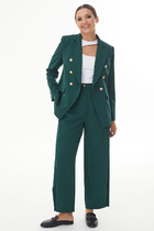 Жакет с центральной двубортной застежкой на пришивные кнопки, без воротника с отложными лацканами. По переду с рельефами, выходящими из проймы, талиевыми вытачками. Спинка со средним швом, рельефами, выходящими из проймы, талиевыми вытачками. Рукав втачной, длинный. Брюки с отрезным поясом, на поясе расположены шлевки. В боковых швах расположены карманы. Вход в карман наклонный к боковому шву. Застежка гульфик. Пояс в области спинки присборен на резинку. Костюм со съемным декоративным поясом. Декоративный пояс из кожзама, декорирован бахромой.