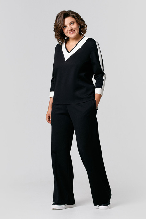 Костюм женский полуприлегающего силуэта с брюками и джемпером выполнен из трикотажного полотна средней плотности.  В джемпере V-образная горловина и втачные рукава дополнены декоративными вставками молочного цвета. Брюки прямые с завышенной линией талии и притачным поясом на резинке, в боковых швах карманы. Изделие прошло тестовую стирку при температуре 30 градусов и химическую чистку: не меняет цвет и не линяет.