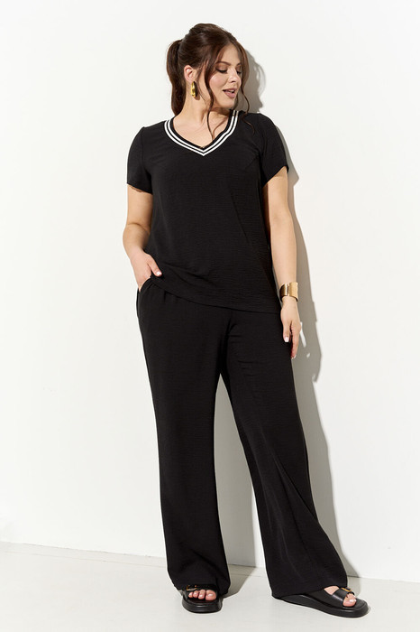 Костюм женский, состоящий из туники и брюк, выполнен из легкой струщейся ткани. Туника свободного силуэта со втачными рукавами; линия горловины с V-образным вырезом и контрастным довязом. Брюки классические, прямого кроя, в боковых швах функциональные карманы, пояс притачной полностью на резинке. Костюм полностью соответсвтует заявленному размеру. Пользуйтесь таблицей замеров готового изделия.