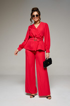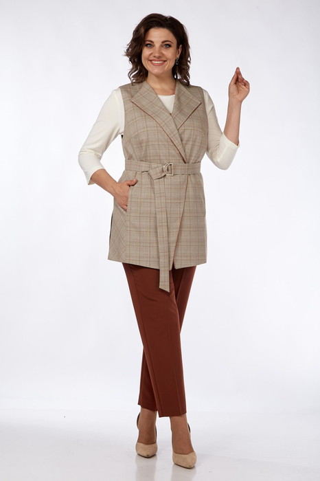 Комплект брючный 3-х предметный состоит из жилетки, брюк и блузы. Жилетка изготовлена из однотонной костюмной ткани прямого силуэта. Воротник пиджачного типа, застежка центрально-бортовая на две петли и пуговицы. По переду обработаны рельефы от нагрудных вытачек, в которых расположены карманы и настрочены клапаны. Спинка со средним швом и шлицей. Жилетка на подкладке. Имеется пояс из отделочной ткани. Брюки средней посадки, пояс частичной на резинке, застежка на молнию и две пуговицы. По передним деталям брюк обработаны боковые карманы с подрезным бочком. Блузка изготовлена из блузочной ткани с принтом. Воротник стойка, переходящая в бант. По переду кокетки со складками. По спинке встречная складка. Рукав втачной на манжете.