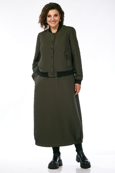 Костюм женский юбочный, изготовлен из ткани с эффектом стежки.Жакет прямого силуэта. По переду нагрудные вытачки,обработаны карманы с листочками. Застежка центральная бортовая на кнопках. Рукава втачные,длинные. По горловине, низу изделия и низу рукава вставлен довяз.Спинка цельнокроеная.Юбка на поясе с резинкой, обработаны боковые карманы. По низу юбки на участках сбоку вставлена резинка.