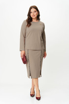 Комплект брючный 3-х предметный состоит из жилета, брюк и джемпера. Жилет из костюмно-плательной ткани прямого силуэта. Горловина V-образной формы. По переду фигурные кокетки, рельефные швы.  Застежка центрально — бортовая на петли и пуговицы. Спинка разрезная с кокеткой. По боковым швам разрезы. На плечевых швах паты с пуговицей. Брюки средней посадки, заужены к низу. По переду боковые карманы с подрезным бочком. По задним деталям накладные карманы. Пояс в 58-62 размере частично на резинке. Джемпер из трикотажного полотна. Рукав спущенный. По переду печать.