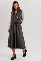 Комплект женский, брючный 3-х предметный, состоит из шазюбля, брюк и топа. Шазюбль свободного силуэта из шифона. Горловина оформлена капюшоном, застежка на петли-пуговицы. Рукава цельнокроеные по низу пата с пуговицей. В боковых швах обработаны кулисы и разрезы. Топ и брюки изготовлены из легкой костюмной ткани. По переду топа нагрудные вытачки, горловина круглой формы, обработана отделочной тканью. Внизу-нашивка. Брюки свободного кроя. Пояс на резинке, обработаны боковые карманы.