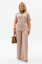 Комплект брючный, состоит из туники и брюк. Туника свободного силуэта из вискозной ткани. Горловина оформлена воротником, спереди фигурный вырез. Рукава цельнокроеные. В боковых швах внизу обработаны высокие разрезы со стяжкой. Брюки средней посадки, прямые. В передних деталях брюк расположены карманы. Пояс на резинке.