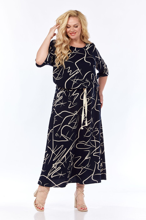 Комплект женский свободного силуэта, состоит из нижнего платья и блузы. Изготовлен из вискозной плательной ткани. Платье комбинированное, верхняя часть из трикотажного полотна. В боковых швах обработаны карманы. Горловина блузы круглой формы. Рукав втачной с отложной манжетой. По низу блузы кулиса на резинке фиксируется на линии талии.