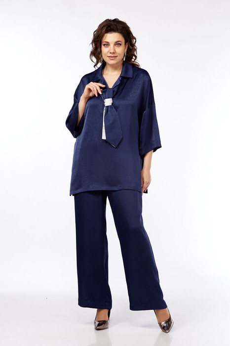 Костюм брючный двухпредметный, выполнен из костюмно-плательной ткани с эффектом легкой мятости. Состоит из блузки и брюк. Блузка свободного силуэта. Воротник стояче-отложной с  лацканами переходящими в планку. На спинке кокетка, со встречной складкой. Рукава спущенные. Изделие дополнено съемным декором. Брюки средней посадки, свободного кроя. Пояс притачной на эластичной тесьме. В передних деталях обработаны карманы с подрезным бочком.