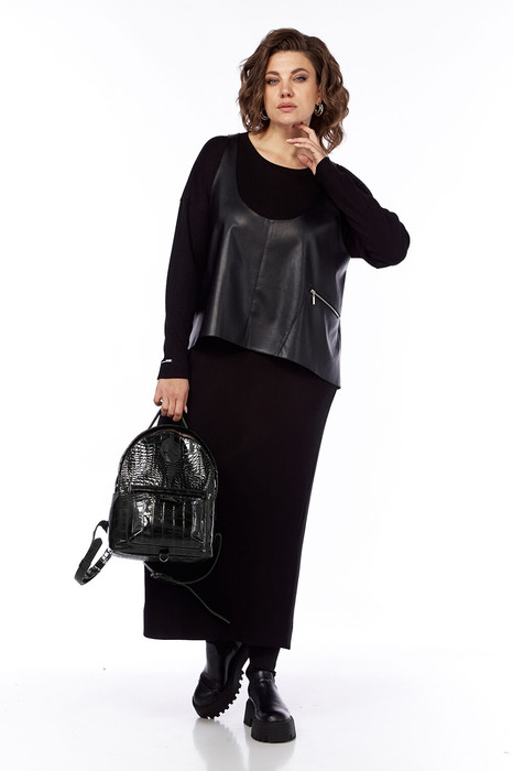 Комплект женский двухпредметный состоит из платья и жилетки. Платье свободного силуэта выполнено из трикотажного полотна ( лапша ). Перед и спинка цельнокроеные. Рукава спущенные. Жилетка выполнена из искусственной кожи на вискозной основе, А — силуэта. Перед со средним швом и асимметричным декоративным элементом. Спинка разрезная по центру.