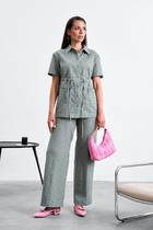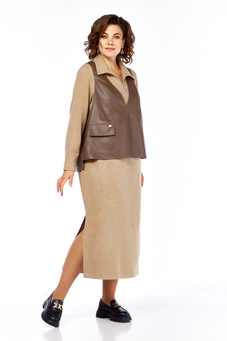 Комплект женский повседневный, состоит из жилета и платья. Жилет прямого силуэта выполнена из эко-кожи на вискозной основе. Перед разрезной по центру и по линии талии, в верхней части обработаны рельефы. В нижней части переда асимметричный накладной карман с клапаном. Спинка разрезная по центру, на кокетке. Все швы жилета отстрочены отделочными нитками. Платье выполнено из трикотажного полотна, прямого силуэта с воротником и подрезными планками. В боковых швах обработаны разрезы внизу. Рукава втачные. По низу рукава — декоративная нашивка.