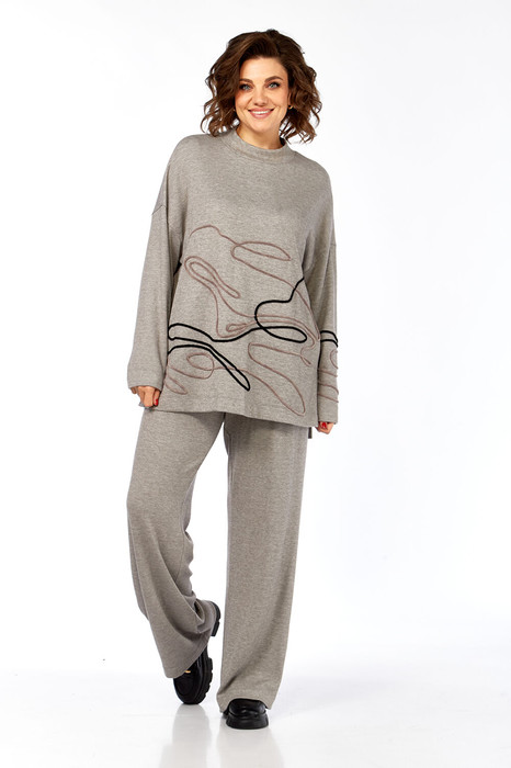 Костюм брючный двухпредметный изготовлен из трикотажного полотна. Состоит из джемпера и брюк. Джемпер свободного кроя. Горловина обработана воротником-стойкой. По переду, спинке и рукаву — вышива шнуром. В боковых швах внизу обработаны разрезы. Рукава спущенные длинные. Брюки прямого силуэта, обработан пояс на резинке. В брюках  имеются карманы.