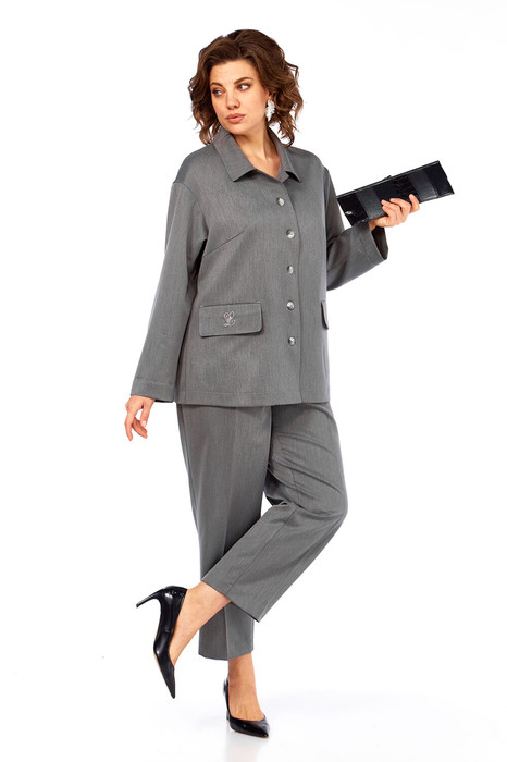Костюм женский двухпредметный, состоит из жакета и брюк, выполнен из однотонной костюмной ткани. Жакет прямого силуэта со стояче-отложным воротником и центрально-бортовой застежкой на петли и пуговицы. По переду обработаны нагрудные вытачки и прорезные карманы с клапаном. Спинка на притачной кокетке. Рукава слегка спущенные. Брюки классической посадки, пояс притачной частично на эластичной тесьме. Застежка на петли и пуговицы. По передним деталям брюк обработаны карманы с листочкой. Костюм дополнен дизайнерской вышивкой.