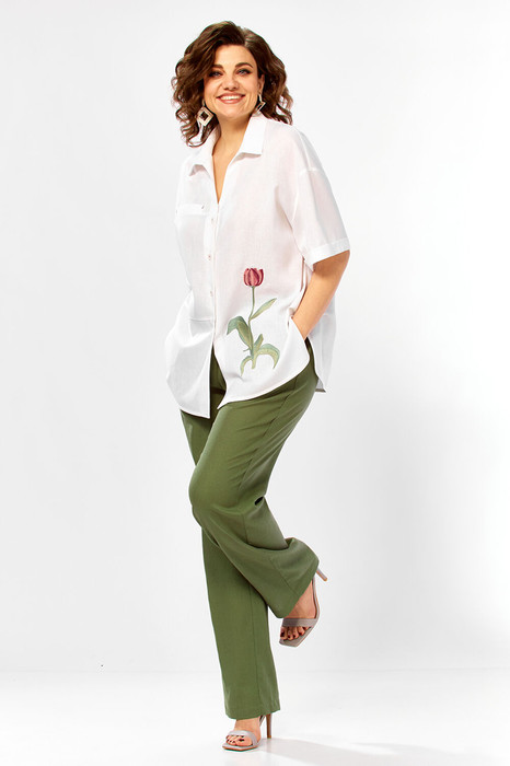Костюм брючный летний, выполнен из натуральной ткани, состоит из блузки и брюк. Блузка свободного силуэта, с воротником рубашечного типа. Горловина V-образной формы, застежка центральная на петли с пуговицами. По переду ассиметричный декоративный элемент. Спинка с притачной кокеткой и средним швом. Рукава спущенные с отложными манжетами. Низ изделия фигурной формы. Блузка декорирована дизайнерской вышивкой. Брюки прямого силуэта, с притачным поясом. В передних деталях обработаны карманы с подрезным бочком.