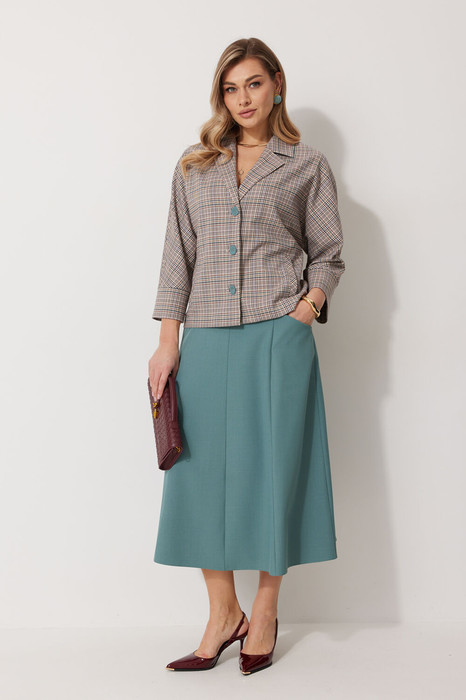Костюм женский, состоящий из жакета и юбки. Жакет без подкладки, кроя «летучая мышь», с центральной однобортной застежкой на петли и контрастные пуговицы. По переду обработаны вертикальные прорезные карманы с листочкой. Спинка цельнокроеная.  Горловина V-образной формы, обработана воротником пиджачного типа с контрастным кантом. Рукав 7/8, по низу обработан широкой притачной манжетой.  Юбка женская А – силуэта длиной до середины икры. Перед юбки состоит из 4 клиньев. Вверху передней части юбки располагается карман с отрезным бочком. Спинка юбки состоит из 4 клиньев. По среднему шву юбки находится застежка – молния.  Верхний срез юбки обработан обтачкой.