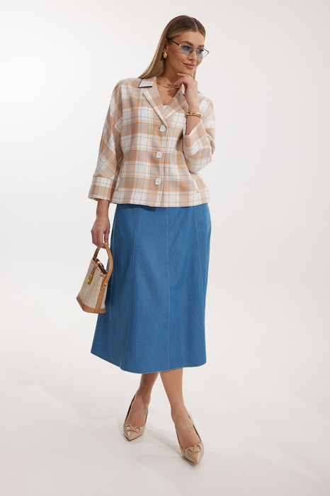 Жакет в клетку без подкладки, кроя «летучая мышь», с центральной однобортной застежкой на петли и контрастные пуговицы. По переду обработаны вертикальные прорезные карманы с листочкой. Спинка цельнокроеная.  Горловина V-образной формы, обработана воротником пиджачного типа с контрастным кантом. Рукав 7/8, по низу обработан широкой притачной манжетой.