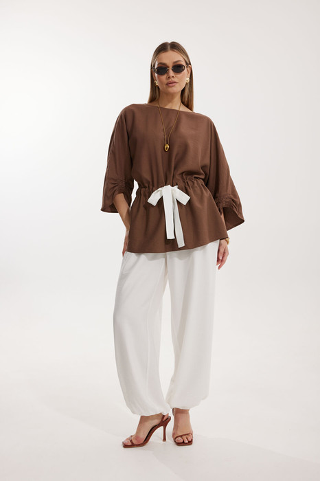 Блуза кроя «летучая мышь» длиной за линию бедра. Перед цельный с округлой горловиной. Спинка со средним швом. В районе талии обработана кулиса с широким контрастным поясом. По низу рукава по передней части выполнено несколько рядов сборки. Горловина обработана окантовкой.
