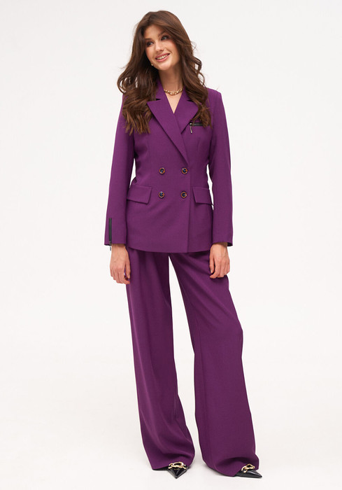 Женский костюм 2-ка, состоящий из жакета и брюк. Двубортный жакет полуприлегающего силуэта с декоративными элементами ввиде молнии со входом в карман на груди и молнией по низу рукава. По переду два настрочных клапана. Сзади шлица. Брюки женские большого объема, прямого силуэта, вида «палаццо». На передних половинках брюк по линии талии заложены две односторонние складки, направленные в сторону бокового шва и функциональные карманы с отрезным бочком. На задних половинках находятся по две талиевые вытачки. Пояс отрезной, притачной, с уступом на правой передней половинке. На поясе шлевки. Верхний край пояса расположен на естественной линии талии. Застежка брюк – классический гульфик. Застежка пояса на две пуговицы и две петли. Длина брюк в пол.