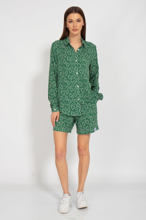 Костюм. Рубашка вискоза полуприлегающего силуэта с втачными рукавами, удлиненная по спинке. Обработка низа рубашки в форме овала. Шорты вискоза свободного кроя. Карманы в боковых швах.