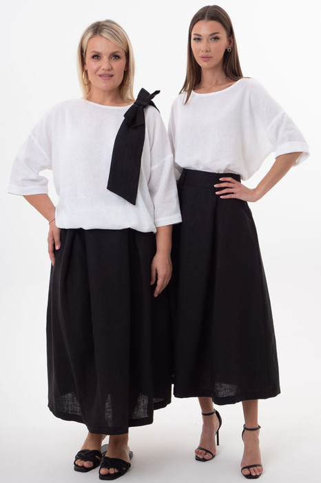 Элегантный костюм премиум-класса из белорусского льна с вискозой премиального качества — идеальный баланс романтики, практичности и экологичности. Набор включает джемпер свободного прямого кроя со съемным декоративным бантом и длинную юбку с эффектными встречными складками, боковыми карманами и потайной молнией. Натуральные материалы обеспечивают легкость, воздухопроницаемость и гипоаллергенность, сохраняя безупречный вид в любых ситуациях.