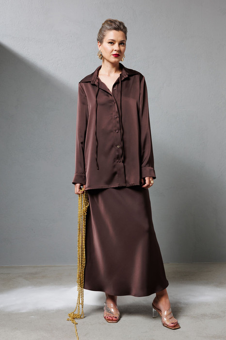 Атласный юбочный комплект. Комплект состоит из блузки свободного кроя и юбки в пол. Блузка трансформер, можно сделать ее более приталенной застегнув ремешок, а можно завязать по переду и спустить на плечи, для более расслабленного образа. В юбке застежка на потайную тесьму-молнию. Ткань плотная, струящаяся. Длина блузки- 73 см, длина юбки - 96 см с поясом.
