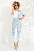 Летний брючный костюм в стиле сафари из костюмной ткани лен-вишер. Жакет рубашечного кроя, свободного силуэта с кокеткой, можно носить по пояс( входит в комплект, длина 180см)так и без пояса. Спереди на полочках имеются 4 накладных кармана с клапанами, которые застегиваюся на петли-пуговицы. Воротник отложной, рукав втачной с манжетом. Спинка жакета со средним швом. В боковых швах разрезы. Детали жакета имеют двойную отстрочку. Брюки прямые, свободного кроя, средней посадки, пояс по спинке и частично спереди на резинке, спереди на брюках иммитация застежки на молнию. Карманы настрочные прямоугольной формы со скосами к боковым швам.