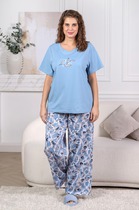 Брюки на бедрах, плотно облегающие вверху и расширенные к низу. Пояс притачной, по спинке пояса вставлена эластичная тесьма. Застежка на тесьму-молнию, 1 потайной крючок и 1 потайную петлю и пуговицу. В боковых швах обработаны наклонные карманы, на передних и задних половинках брюк обработаны вытачки и заутюжены «канты». Внизу шаговых швов обработаны шлицы. На поясе прикреплены 5 шлёвок.