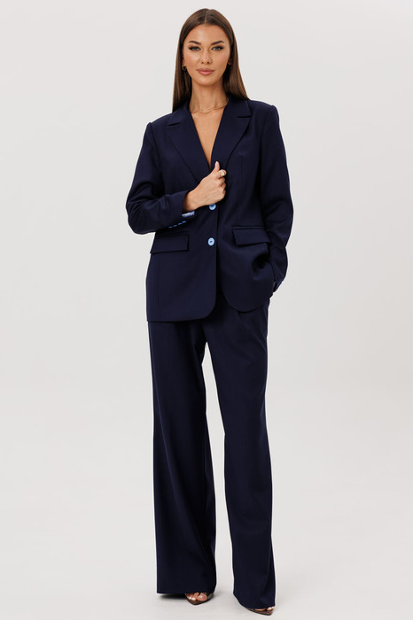 Стильный гармоничный комплект в стиле умеренного оверсайза, состоящий из свободного жакета и широких брюк. Эффектной деталью комплекта выступает высокая открытая шлица на спинке жакета, закрепленная пуговицами.