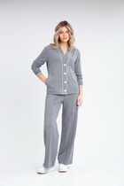 Брюки комплекта созданы в свободном стиле. Силуэт брюк к низу изделия имеет расклешение. В пояс брюк по спинке вставлена эластичная тесьма, шириной 3 см. Спереди пояс фиксируется горизонтально на петли/пуговицы и вертикальную закрытую клапан-молнию (гульфик). При желании в пояс можно вставить ремень, так как имеются шлевочные держатели. В боковых швах: карманы с наклонным входом, на поясной линии талии переда расположена неглубокая складка для свободы движения, на задних полотнищах линии талии-вытачки. Длина брюк по боковому шву 108 см (без учета высоты пояса).