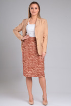Стильный комплект, состоящий из блузона и юбки, из костюмной ткани. Блузон прилегающего силуэта, слегка расклешён к низу. Спинка со средним швом. В среднем шве спинки – потайная застёжка-молния. Длина по спинке – 56,5 см. Горловина обработана стойкой – воронкой, высотой- 3,5 см. Рукав – реглан, слегка расклешён к низу. Длина рукава – 41,5 см. Юбка прилегающего силуэта, зауженная к низу, по среднему шву – потайная застёжка на тесьму – молнию, в низу – разрез. Верхний край обработан обтачкой. Длина юбки по боковому шву – 64 см. Юбка на подкладке. Декор – ремень, может отличаться от заявленного на фото.