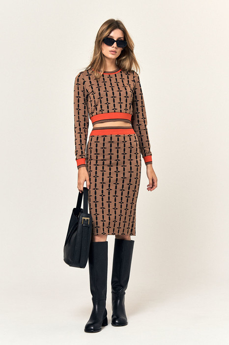 Комплект женский из трикотажного полотна состоящий из укороченного джемпера и юбки.