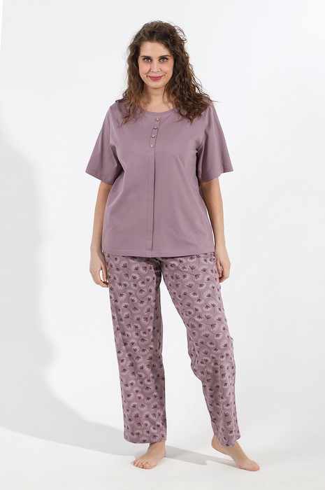 Костюм женский из трикотажного полотна «кулирка» в комбинации двух видов ткани гладкокрашеной и с набивным рисунком, состоящий из футболки и брюк. Футболка - из гладкокрашеного полотна, классического покроя, с короткими втачными рукавами, горловиной овальной формы, обработанной притачной бейкой. Перед – с застроченной складкой, расположенной по центру и имитирующей застежку на пуговицы.Брюки - из полотна с набивным рисунком, длинные, свободные, с карманами в боковых швах, на притачном поясе с эластичной тесьмой внутри.