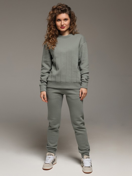 Костюм молодежный из гладкокрашеного трикотажного полотна «футер- трехнитка», состоящий из джемпера и брюк овальной формы, обработанной втачной планкой и притачным поясом по низу. Рукава – с притачными манжетами. Манжеты, планка горловины и пояс выполнены из полотна «кашкорсе» такого же цвета, как и основной материал. На полочке застрочены декоративные складочки-защипы, расположенные симметрично относительно линии центра. Брюки – длинные, на притачном поясе с эластичной тесьмой внутри и манжетами по низу. Передние половины – из двух частей каждая, со смещением соединтельных швов в сторону боковых срезов. Соединительные швы передних половин обработаны с карманами. Пояс и манжеты выполнены из трикотажного полотна «кашкорсе».