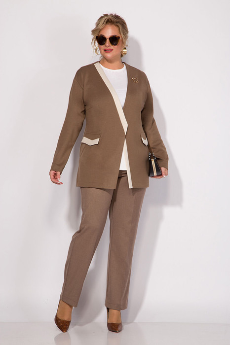 Эффектный стильный удлиненный кардиган, выполнен из трикотажного полотна в оттенке капучино. Глубокий v-образный вырез горловины декорирован ассиметричными планками из отделочной ткани. Застежка с подбортом на металлическую кнопку. Плечевой пояс спущенный, рукав полной длины.  По полочке расположен декоративный клапан с карманами. Для свободы движения предусмотрены разрезы по боковым швам. Спинка без особенностей.