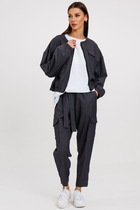 Жакет прямого силуэта. Воротник пиджачного типа. Передние половинки жакета с нагрудными вытачками и центральной застёжкой на петли и пуговицы. В боковых швах небольшие разрезы. Рукав втачной одно-шовный. Брюки свободного кроя, прямые. Передние половинки брюк с двумя складками по переду и застёжкой по типу «гульфик». Верхний срез брюк обработан притачным поясом, по бокам вставлена резинка. В боковых швах карманы «хулиганы».