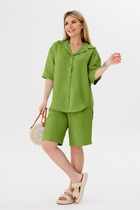 Рубашка «оверсайз», с отложным рубашечным воротником на стойке, застежка центральная на петли и пуговицы. По переду от плечевого шва рельефы. По низу рубашки в рельефных швах разрезы. Спинка с отрезной кокеткой и встречной складкой. Рукав со спущенной линией плеча, с декоративной патой на петлю и пуговицу. Шорты на притачном поясе на резинке с декоративным шнуром. В боковых швах карманы с наклонным входом.