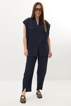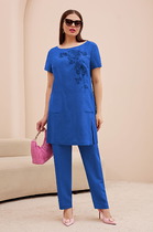 Минималистичный дизайнерский комплект с вышивкой выполнен из натурального льна. Удлиненная блузка прямого силуэта с накладными карманами и округлым вырезом украшена авторской вышивкой с цветочным мотивом. Перед оформлен отрезными бочками с нагрудными вытачками, спинка со средним швом. Застежка на потайную молнию в среднем шве спинки. Рукава втачные. Прямые брюки средней посадки с отрезным поясом на резинке по спинке и бокам , по низу в боковых швах обработаны разрезы. Застежка обработана по классической технологии (гульфик с молнией и пуговица на поясе).