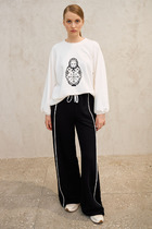Брюки на поясе с резинкой и наклонными карманами к боковым швам.