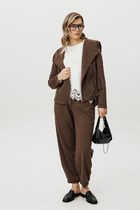 Костюм интересного кроя с фигурными боковыми выемками зрительно вытягивает силуэт. Блузон полуприлегающего силуэта с V-образным вырезом и воротником – стойкой. Центральная застежка на стильные металлические пуговицы и пробивные петли с глазком. Клапаны и паты с декоративными пуговицами дополняют образ. Спинка без шва. Рукав - крыло фиксируется на пату. Юбка с отрезным поясом, по бокам на резинке, застежка на потайную молнию в среднем шве .На передней части юбки боковые карманы и вертикальные рельефы ,боковая часть с подрезом и 2-мя складками. Костюм без подкладки.