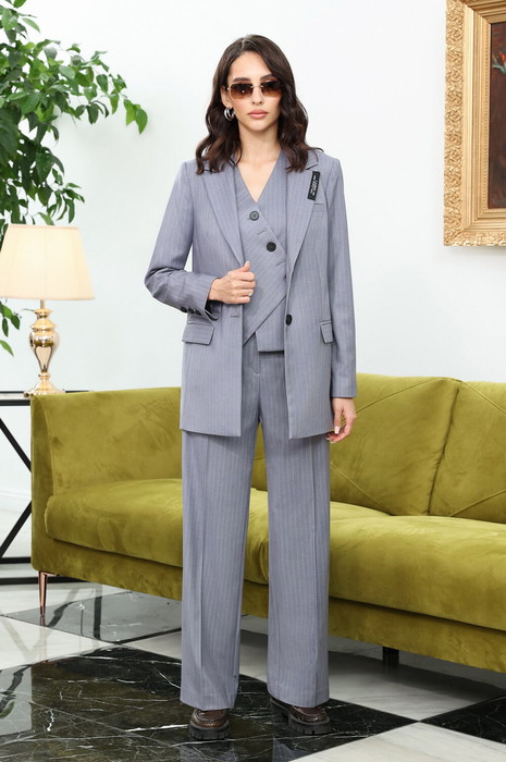 Жилет с V – образным вырезом горловины, смещённой застёжкой на петли и пуговицы. Изделие с фигурным низом. Перед с карманами с листочками в нижней части. Спинка с талиевыми вытачками. Жилет на подкладке.