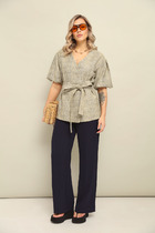 Дизайнерский брючный костюм с блузой. Современная интерпретация и новый взгляд на понятие классики, отличный выбор для поклонников минимализма. Жакет прямого силуэта с накладними карманами. Жакет с V-образным вырезом и воротником стойкой, застегивается на одну пуговицы. Перед оформлен вытачками из плечевого шва. Спинка с выточкой и средним швом. Рукава втачные с верхней и нижней частью с возможностью завернуть манжету. Блуза с нагрудными вытачками из бокового шва и коротким рукавом. Вырез горловины круглый с планкой.Прямые брюки прямого кроя с косыми карманами и отрезным поясом, по бокам на резинке. Застежка обработана по классической технологии (гульфик с молнией и пуговица на поясе). Вся обработка выполнена как в классических итальянских костюмах. Жакет на подкладке.