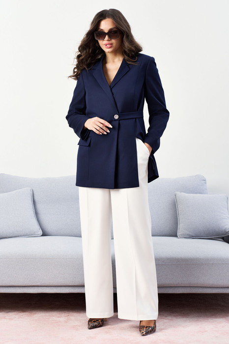 Жакет со стояче-отложным воротником пиджачного типа и смещённой застёжкой на пуговицу, в которую застёгивается и декоративная пата. Перед с карманом с клапаном в нижней части и декоративным клапаном. По переду идут два рельефа, один рельеф с разрезом в нижней части. Спинка со средним швом и двумя рельефами. Рукава втачные. Изделие на подкладке.